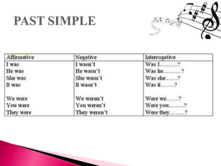 This document provides examples of using past simple tense in English with regular and irregular verbs. It gives the basic rules for forming the past simple by adding "-ed" to regular verbs. Examples are provided of using past simple verbs with subjects, including negative examples using "did not". Question forms are also exemplified using question words like "how, where, when, did". The end provides a brief exercise for students to practice forming past simple verbs.