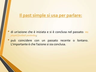 Il past simple è utilizzato per esprimere azioni concluse nel passato, corrispondenti a diverse forme verbali italiane. La sua costruzione varia tra verbi regolari e irregolari e si accompagna a parole chiave come 'yesterday' e 'last'. La forma negativa e interrogativa è formata utilizzando 'did' e la forma base del verbo.