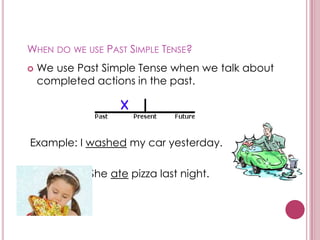 This document discusses the past simple tense in English. It explains that the past simple tense is used to talk about completed actions in the past. It provides examples of regular and irregular verbs in the past tense. It also describes the different types of sentences that can be formed with past simple verbs, including affirmative, negative, and question sentences. Finally, it includes an activity asking the reader to practice forming sentences in the past simple tense.