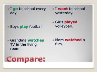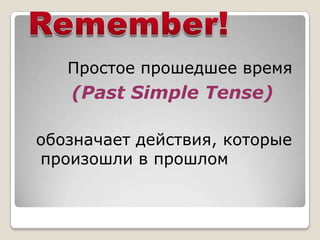 The document discusses the past simple tense in Russian, which is used to describe actions that occurred in the past. It notes that regular verbs form the past tense by adding an "-ed" ending, while irregular verbs have varying past tense forms. Examples are provided of common time expressions that indicate the past tense, such as "yesterday" and "last week." It also explains how to form yes/no questions and negative statements in the past simple tense using the helping verb "did."