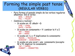 This document provides information about forming and using the past simple and past continuous tenses in English. It explains that the past simple is used to talk about completed actions in the past, while the past continuous expresses ongoing or incomplete actions in the past. It provides examples of regular verb conjugations in the past simple, and how to form the past continuous using "was/were" plus the verb's gerund form. It also discusses using the past tenses in affirmative, negative, and interrogative sentences, and how the past simple and past continuous can be combined using conjunctions like "when", "while", and "as".