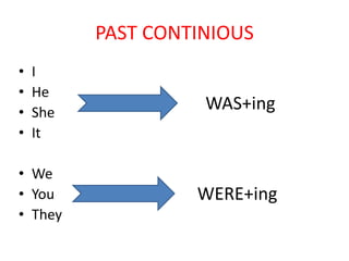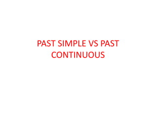 This document compares and contrasts the past simple and past continuous tenses in English. It lists the conjugations for the past continuous, provides examples of its use, and describes situations where either the past simple or past continuous would be used, such as for long actions in progress, short completed actions that interrupted other actions, or parallel actions occurring simultaneously in the past.