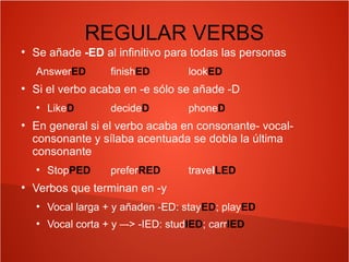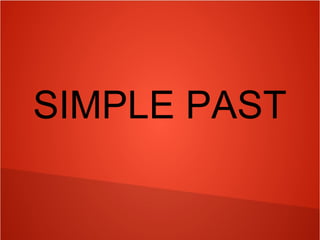 The document provides information about using the simple past tense in English. It discusses forming the past tense of regular verbs by adding "-ed" and lists irregular verbs that must be memorized. It also covers using the simple past in affirmative, negative, and interrogative sentences and gives examples of typical time expressions used with the simple past tense, such as "yesterday" and "last week." Practice exercises are provided to reinforce using the simple past correctly.