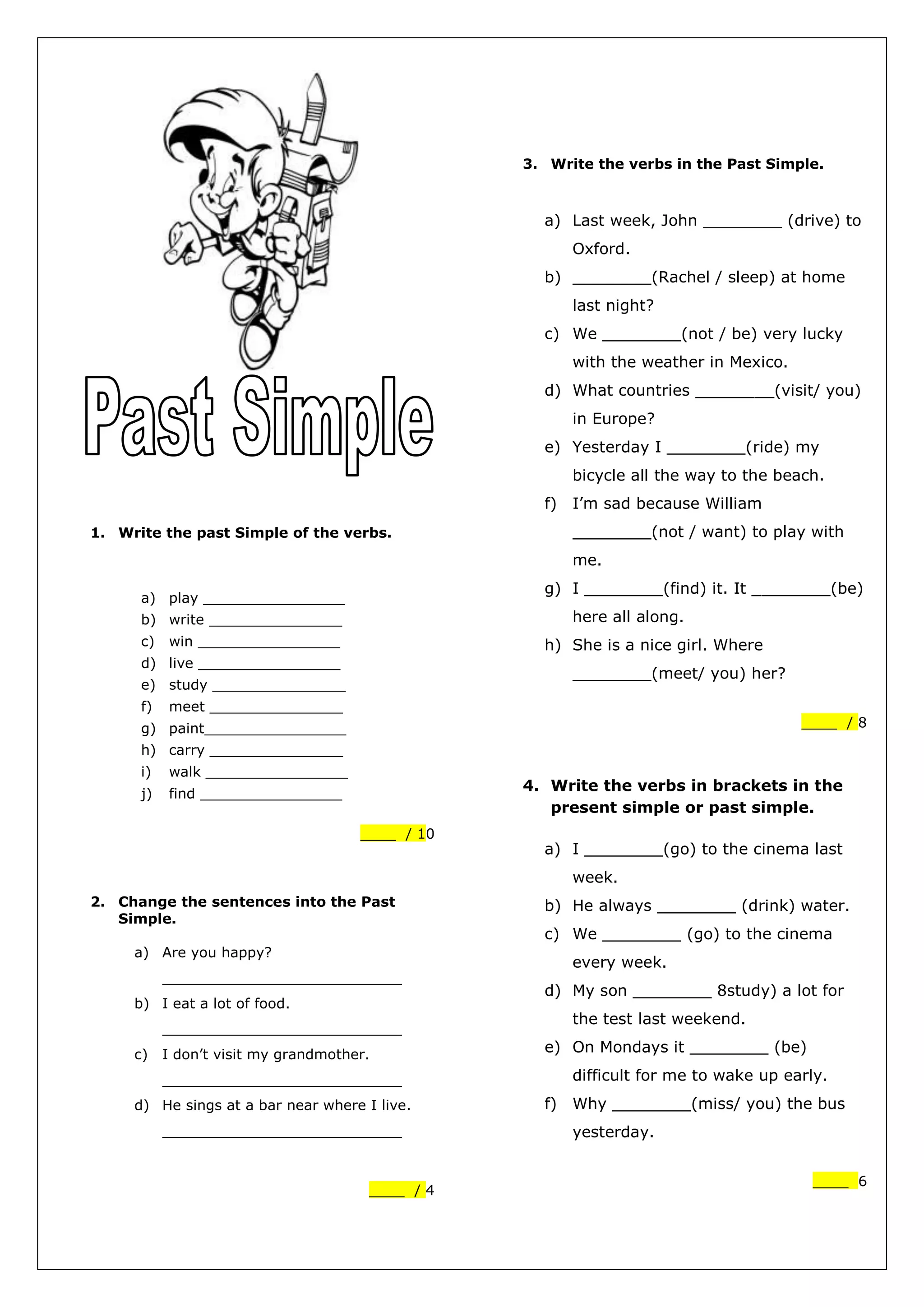 This document provides exercises to practice verbs in the past simple tense. It includes filling in blanks with the past simple form of verbs, changing sentences from present to past simple, and writing verbs in past simple when they are provided in brackets in sentences. The goal is to demonstrate the ability to conjugate verbs to the appropriate past tense form based on the context of the sentences.