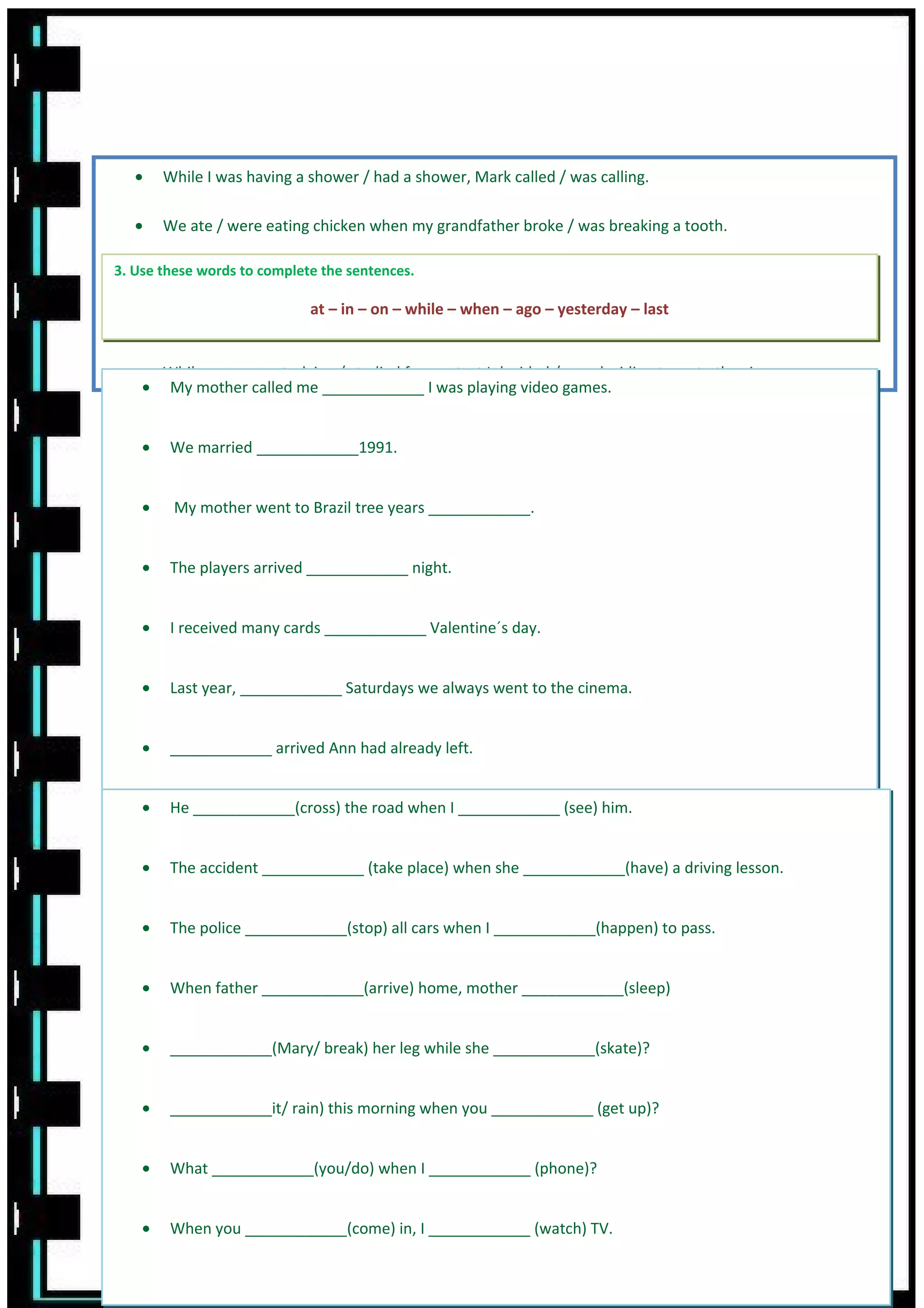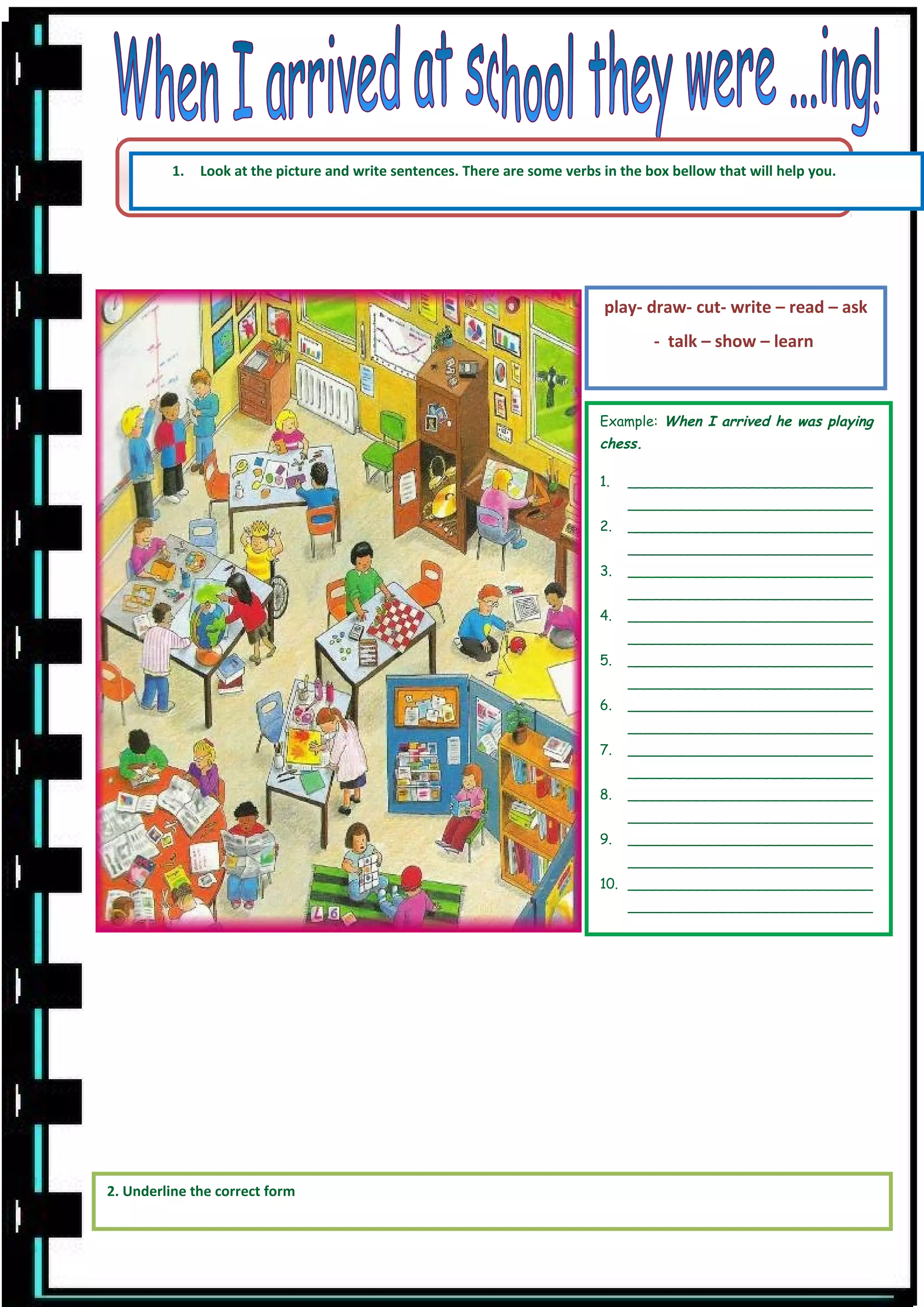 The document summarizes the use of the past continuous and past simple tenses together. When an ongoing action in the past continuous (e.g. "was playing") is interrupted by a single action that occurred at the same time in the past simple ("arrived"), we use both tenses together ("When I arrived he was playing chess"). The document then provides examples for learners to practice this grammar concept.