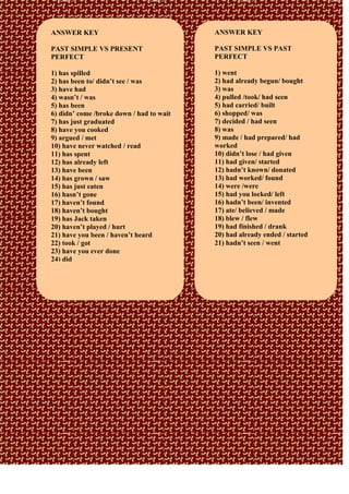 The document compares and contrasts the use of the past simple and present perfect tenses, and the past simple and past perfect tenses. It provides examples of sentences using each tense correctly, with the verbs conjugated according to the tense rules. The key explains which tense should be used for each example sentence.