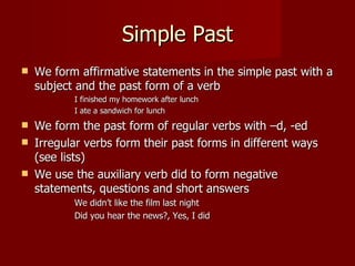 2) It provides examples of how to form each tense and common uses including describing a past action, an interrupting action, or a sequence of events.
