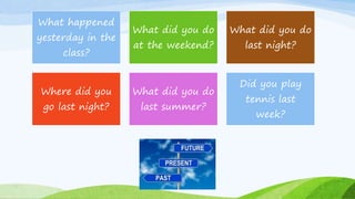 The document discusses how to write sentences in the past tense. It explains that the simple past tense is used to describe actions that were completed in the past, such as yesterday, last week, last year, etc. For regular verbs, the simple past is formed by adding "-ed" to the base form of the verb. Some irregular verbs like "be" also have unique past tense forms - "was" and "were". Questions in the past tense are formed using "did" plus the subject and base form of the main verb, such as "Did you dance yesterday?".