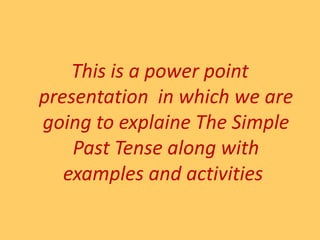 This power point presentation explains the simple past tense through examples and activities. It defines the past tense as referring to actions or states that have already occurred. It discusses the regular and irregular forms of past tense verbs, including using "did" as the past form of "do" and exceptions for the verb "to be". It provides examples of time indicators used with the simple past tense and how to form negatives by adding "didn't" or auxiliary verbs like "was" plus "not". Sample activities are included to practice using the simple past.