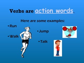 This document discusses verb tenses and how verbs change in the past tense. It provides examples of regular verbs that take "ed" to indicate the past tense, such as "walk" becoming "walked". For verbs ending in "e", only the "d" is added to form the past tense, like "save" becoming "saved". Students are given practice identifying the correct past tense forms of verbs using these rules to talk about events in the past.