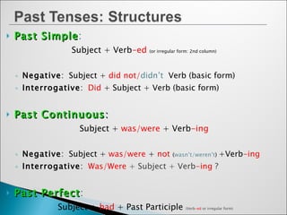 1) It outlines the forms of the past simple, past continuous, and past perfect tenses including their negative and interrogative forms.