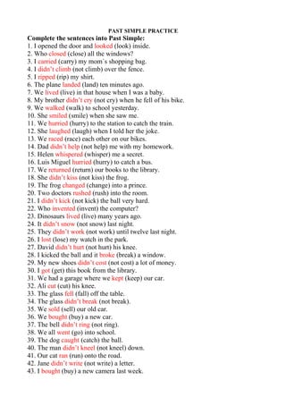 The document provides a practice exercise for using the past simple and past continuous tenses in English. It contains 50 sentences to be completed in the past simple tense and another 50 to be completed in the past continuous tense related to various everyday activities and events. The purpose is to practice conjugating different verbs into the appropriate past tense forms.