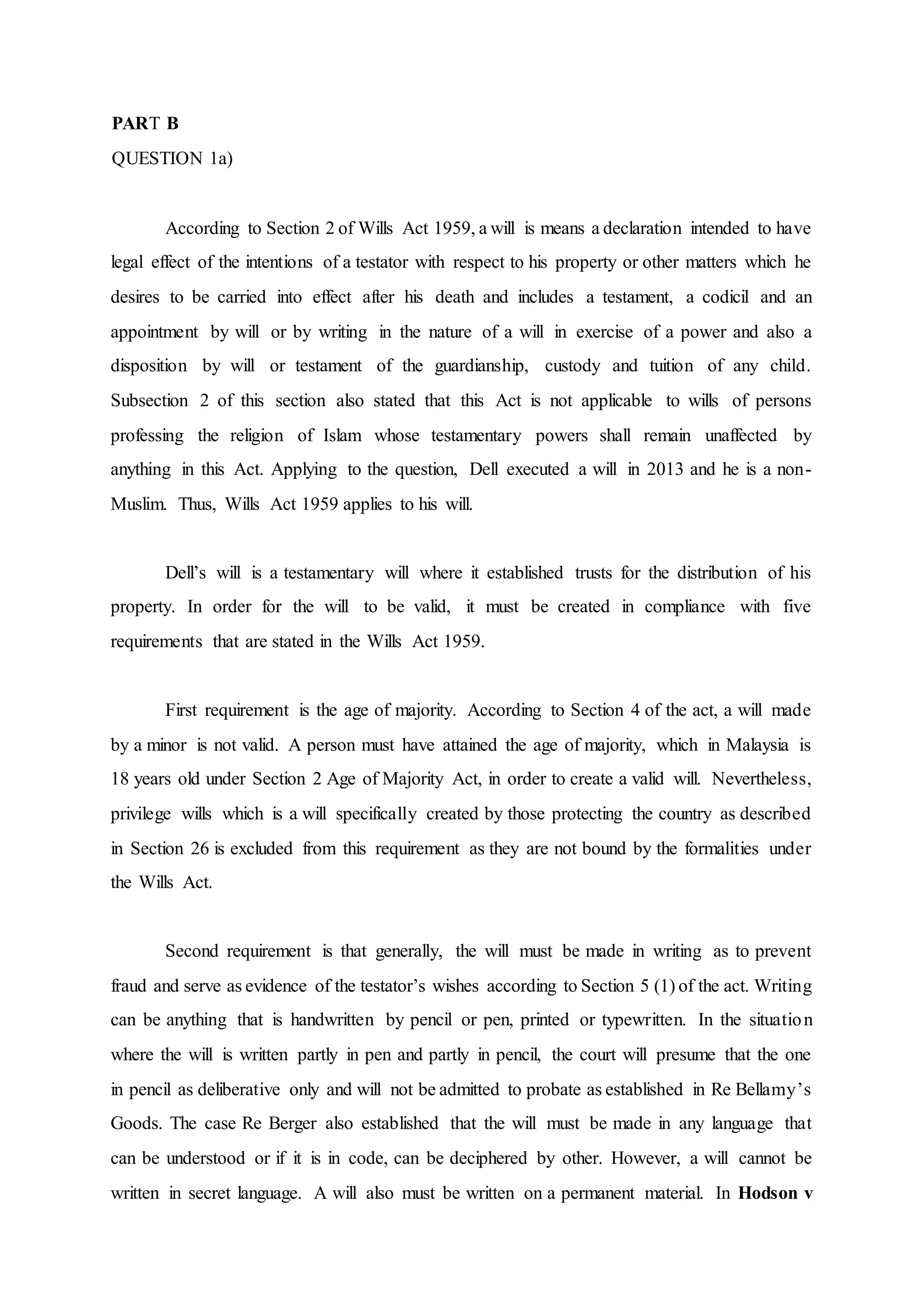 Dell executed a will in 2013 and his will established trusts to distribute his property after his death. For Dell's will to be valid, it must meet the five requirements under the Wills Act 1959: