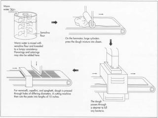 Pasta is produced through a process of mixing milled durum wheat with water and sometimes eggs to form dough. This dough is extruded through dies to form different pasta shapes then dried and packaged. Key steps include mixing ingredients to form dough, extruding the dough through dies to shape it, pre-drying to harden the exterior while keeping the interior soft, then final drying to reduce the moisture content before packaging and shipping pasta for consumption. Pasta should be cooked al dente by stopping the cooking process before it becomes soft.