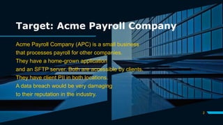 The document outlines Acme Payroll Company's (APC) implementation of threat modeling using the PASTA approach. It describes APC's systems, identifies potential threats, analyzes vulnerabilities, and proposes a strategy for conducting simulated attacks against APC's network and systems. The strategy involves scanning for vulnerabilities, attempting to exploit them using tools like Nessus and Metasploit, and using social engineering techniques like phishing emails to try and obtain credentials or sensitive information from employees. The goal is to help APC identify weaknesses before real attackers can compromise their systems.