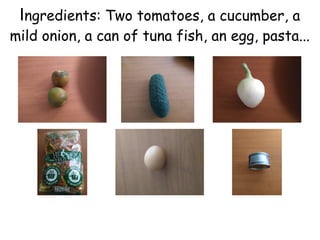 This recipe calls for making a pasta salad with tomatoes, cucumber, onion, tuna fish, egg, pasta, oil, salt, and olives. The tomatoes, cucumber and onion are diced and added to a bowl along with the tuna, boiled egg, salt, and pasta that was boiled for 10 minutes then cooled. Oil is added and mixed together before serving the pasta salad.
