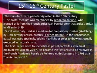 The document provides information about pastels including their origins in the 15th century and early use by artists like Leonardo da Vinci and Federico Barocci. It notes that Rosalba Carriera was the first artist renowned for her pastel portraits in the 1700s. Later, artists like Degas championed pastel, raising it to the brilliance of oil paint. The document also describes the composition of pastels, types including soft and hard pastels, techniques for working with them, and surfaces used.