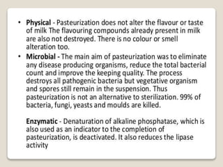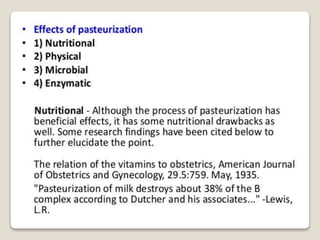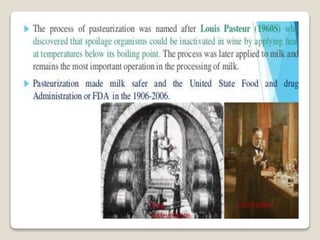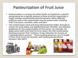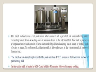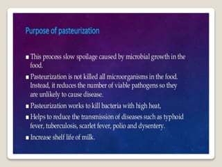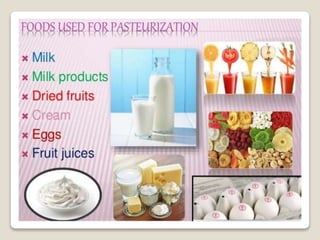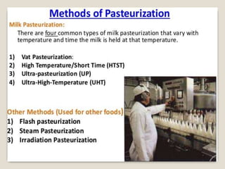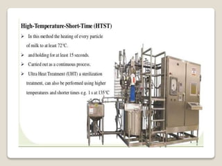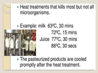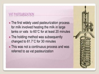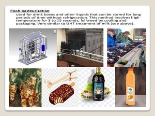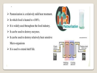 This document provides a comprehensive overview of food preservation through pasteurization, particularly focusing on milk. It details the steps involved in pasteurization, different methods (including vat, HTST, and UHT), advantages and disadvantages, and the importance of maintaining temperature control throughout the process. The document emphasizes the need for proper agitation and heating balance to ensure effective pasteurization and safety in milk production.