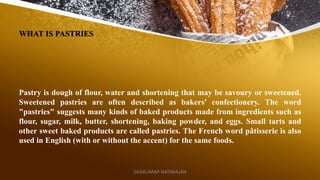 The document discusses various types of pastries, highlighting their ingredients, preparation methods, and common faults. It includes detailed descriptions of short crust, puff, flaky, rough puff, danish, choux, and hot water pastries, including their unique characteristics and baking techniques. Additionally, it provides guidelines for successful pastry making and notes on blind baking and pastry fillings.