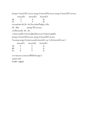 1 คะแนน/ ตอบถูก 2 ตาแหน่งได้ 4 คะแนน/ ตอบถูก 3 ตาแหน่งได้ 7 คะแนน) ตาแหน่งที่ 1 36. 37. ตาแหน่งที่ 2 ตาแหน่งที่ 3 3 1 4 5 H D กระดาษคาตอบ ข้อ 38 - 41 ด้านการคิดแก้ไขปั ญหา 14% 38. 30A (ตอบถูก ได้ 2 คะแนน) การให้คะแนนข้อ 39. - 41. 1 คาตอบ แบ่งเป็ น 3 ตาแหน่ง ผูสอบต้องระบาย A ในตาแหน่งสุ ดท้าย ้ (ตอบถูก 3 ตาแหน่งได้ 4 คะแนน/ ตอบถูก 2 ตาแหน่งได้ 2 คะแนน) *หมายเหตุ ตอบถูก 2 ตาแหน่ง หมายถึง ตาแหน่งที่ 1 และ 3 หรื อ ตาแหน่งที่ 2 และ 3 ตาแหน่งที่ 1 ตาแหน่งที่ 2 ตาแหน่งที่ 3 39. 40. 41. 5 1 4 3 2 3 การรวมคะแนน รวมคะแนนที่ได้แล้วนามาคูณ 3 เฉลยจาก สทศ. Credit : sageal A A A