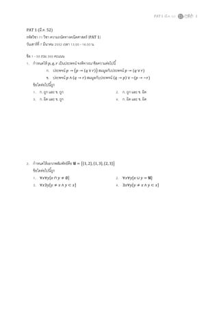 52) 1 PAT 1 (มี.ค. 52) รหัสวิชา 71 วิชา ความถนัดทางคณิตศาสตร์ (PAT 1) วันเสาร์ที 7 มีนาคม 2552 เวลา 13.00 - 16.00 น. ข้อ 1 - 50 รวม 300 คะแนน 1. กําหนดให้ , ,ݍ ݎ เป็นประพจน์ จงพิจารณาข้อความต่อไปนี ก. ประพจน์ → ൫ → (ݍ ∨ )ݎ൯ สมมูลกับประพจน์ → (ݍ ∨ )ݎ ข. ประพจน์ ∧ (ݍ → )ݎ สมมูลกับประพจน์ (ݍ → ) ∨ ~( → ~)ݎ ข้อใดต่อไปนีถูก 1. ก. ถูก และ ข. ถูก 2. ก. ถูก และ ข. ผิด 3. ก. ผิด และ ข. ถูก 4. ก. ผิด และ ข. ผิด 2. กําหนดให้เอกภพสัมพัทธ์คือ U = ൛ሼ1, 2ሽ, ሼ1, 3ሽ, ሼ2, 3ሽൟ ข้อใดต่อไปนีถูก 1. ∀ݕ∀ݔሾݔ ∩ ݕ ≠ ∅ሿ 2. ∀ݕ∀ݔሾݔ ∪ ݕ = Uሿ 3. ∀ݕ∃ݔሾݕ ≠ ݔ ∧ ݕ ⊂ ݔሿ 4. ∃ݕ∀ݔሾݕ ≠ ݔ ∧ ݕ ⊂ ݔሿ