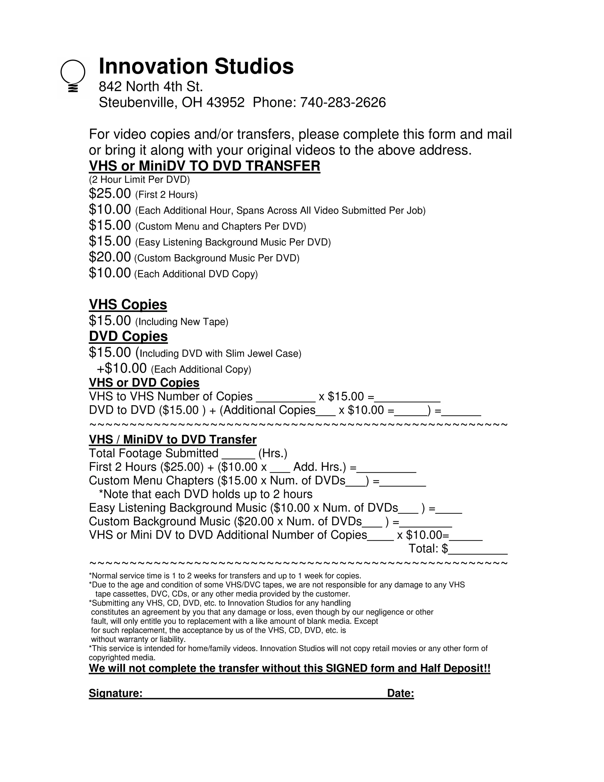 The document provides information about video transfer and copying services offered by Innovation Studios located in Steubenville, OH. It lists pricing for transferring VHS or MiniDV videos to DVD starting at $25 for the first 2 hours and $10 for each additional hour, with options to add custom menus, chapters, and background music. Copies of VHS or DVDs are $15 each. The final section is a form for customers to provide details about their transfer request and preferences for chapter markers or background music.