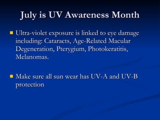 The document provides information about low vision rehabilitation and tips for independence with low vision. It defines low vision as vision impairment that cannot be fully corrected and discusses how low vision specialists can assess functional vision and prescribe optical and electronic aids, as well as provide rehabilitation services, to help those with low vision maximize their remaining sight and function independently. Common causes and types of vision loss are described along with the roles of different eye care professionals in low vision care.