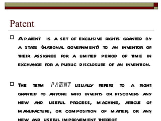 Patent law provides exclusive rights to inventors for a limited period of time in exchange for publicly disclosing their inventions. India's patent law has evolved over time from the first patent law in 1856 to the modern law of 1970 which was amended in 1999 and 2005. The law provides for both product and process patents with a term of 20 years. It includes safeguards for compulsory licensing and parallel imports to ensure availability of medicines. The patent office has been modernized with increased examiners and IT systems to improve patent administration.