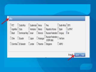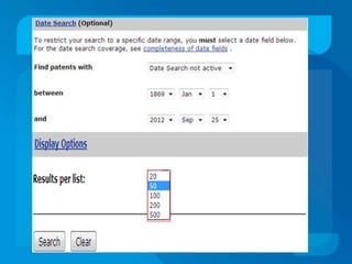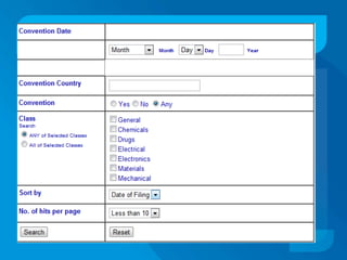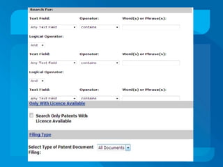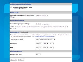This document discusses patent databases and how to search within them. It defines what a patent is - an exclusive right granted by a government for an invention. It also defines what a database is - a collection of organized information that can be easily accessed. The document outlines several major patent databases including PatentScope from WIPO, EKASWA from India, EPIDOS-INPADOC from Europe, and the Canadian Patents Database. It provides details on how to search within each database using basic, advanced, boolean, or other specialized search features.