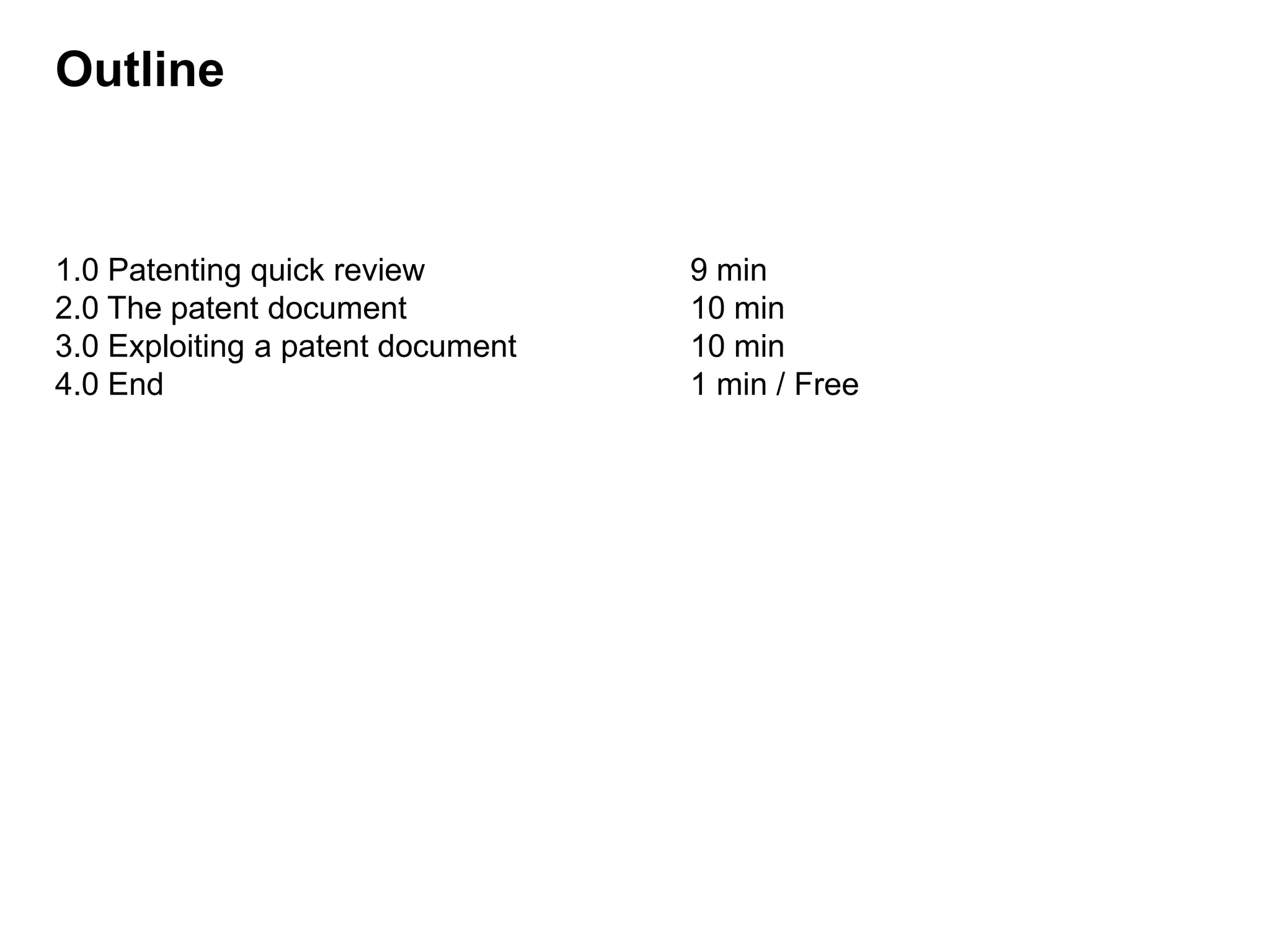 The document discusses the patent document, its form and substance. It begins with a review of patenting concepts such as the definition of a patent, reasons for patenting, and patentability requirements. It then discusses the typical parts of a patent document, including the title, abstract, claims, specifications, and drawings [SECTION 2]. The document explains how to construct a patent document and stresses the importance of a clear disclosure of the invention. Finally, it discusses how to exploit patent document information to learn about the inventor's goals for protection, competitors, markets, and more [SECTION 3].
