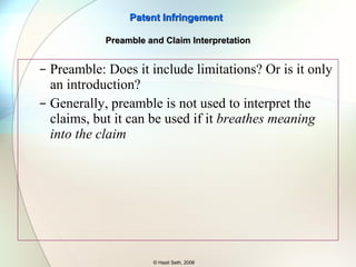 This document discusses the principles of patent infringement law, specifically focusing on 35 U.S.C. §271 and the concepts of literal infringement and the doctrine of equivalence (DOE). It reviews key court cases, such as Autogiro Co. of America v. United States and Hilton Davis Chemical Co. v. Warner-Jenkinson Co., outlining how claims are interpreted, the all-elements rule, and the standards for determining infringement. The text emphasizes the importance of understanding the claims and specifications in evaluating whether an invention has been infringed.