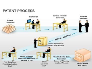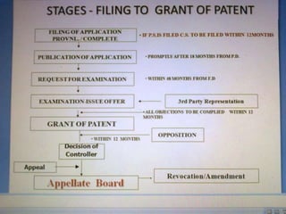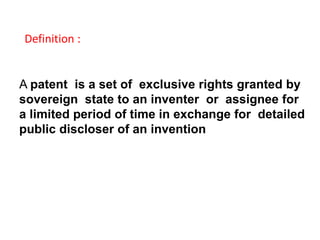 This document provides an overview of patent processing and applications. It defines a patent as a set of exclusive rights granted by a government to an inventor for a limited time in exchange for publicly disclosing an invention. The document discusses the patent process, types of patents including utility patents, design patents and plant patents. It also describes different types of patent applications including national, regional, international and provisional applications.