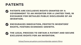 The document outlines the types, processes, deadlines, and requirements for patent registration, emphasizing the importance of patents in encouraging innovation and protecting inventors' rights. It details the steps involved in filing a patent application, the examination process, and the significance of meeting deadlines to maintain patent rights. Additionally, it highlights the Patent Cooperation Treaty (PCT) for international patent filing, enabling broader protection for inventions across multiple countries.