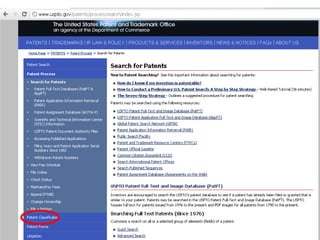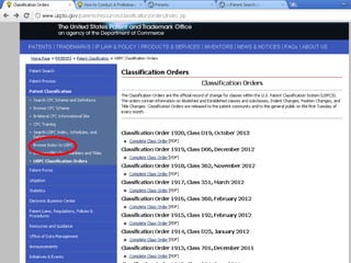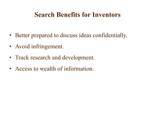 This document provides information about conducting a patent search, including the benefits of searching, criteria for patentability, what constitutes prior art, examples of prior art, and a 7-step search strategy. It discusses using keywords, the US and CPC patent classification systems, verifying relevancy, international searching, and gives examples to illustrate concepts like how terminology can change over time.