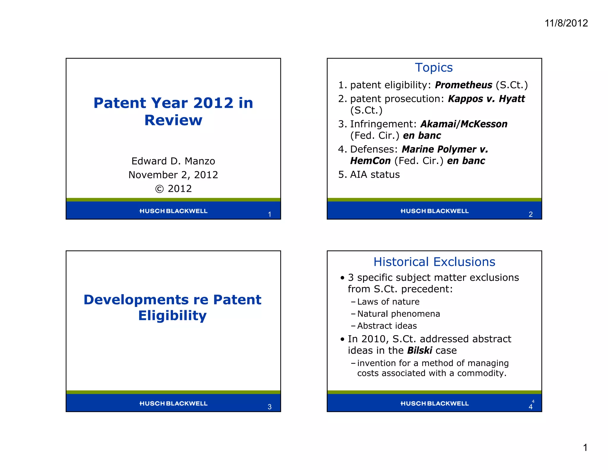 This document provides a summary of recent developments in patent law in 2012, including key Supreme Court and Federal Circuit cases. It discusses the Prometheus v. Mayo, Kappos v. Hyatt, Akamai v. Limelight / McKesson v. Epic Systems, and Marine Polymer Tech v. HemCon cases and their implications. The Prometheus case established that natural laws cannot be patented without significantly more, while Kappos v. Hyatt affirmed that new evidence can be introduced during a Section 145 appeal. Akamai expanded what can constitute induced infringement for method claims.