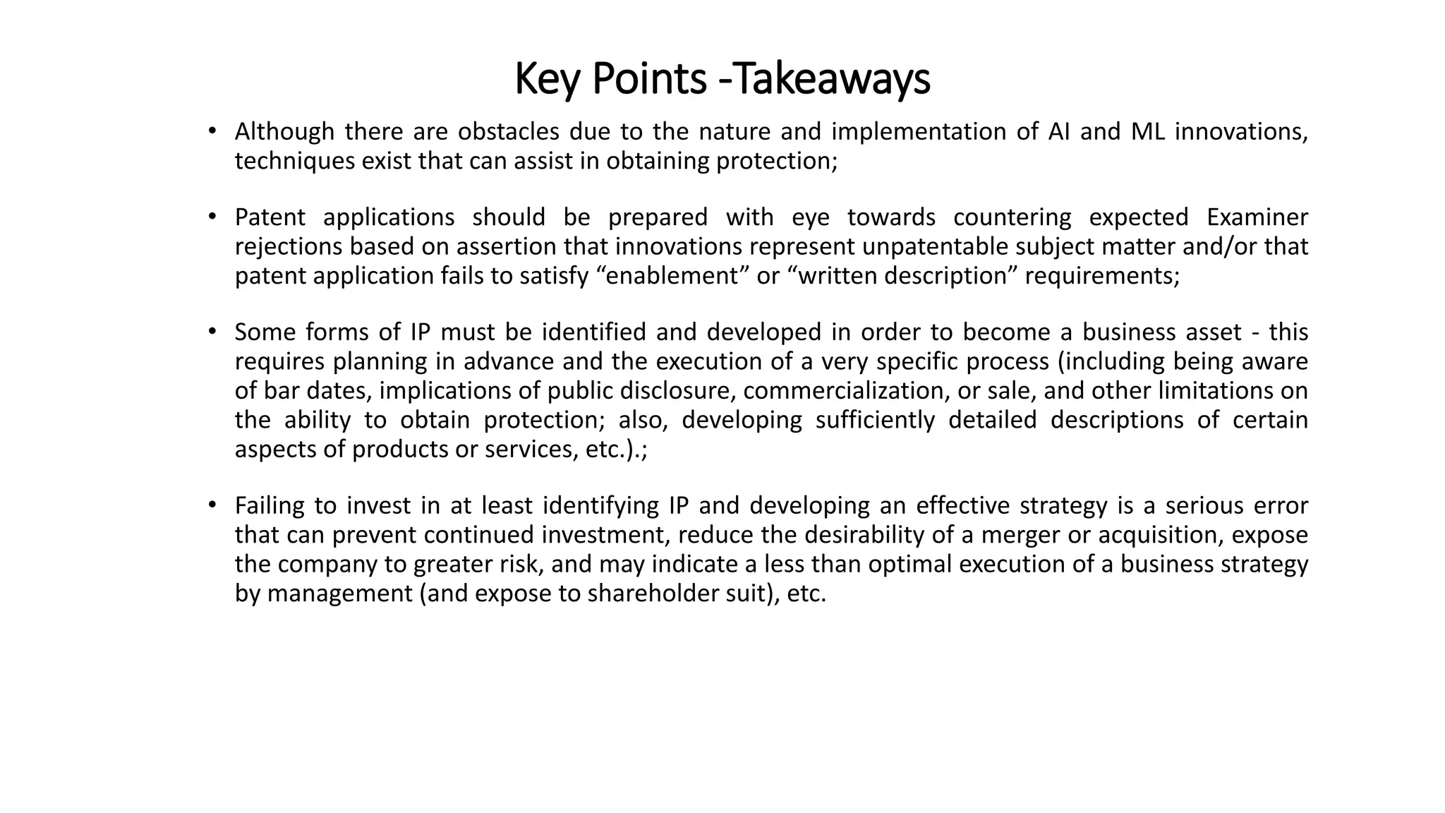 The document discusses the challenges and strategies for patenting AI and machine learning innovations, highlighting the importance of preparing patent applications to counter expected examiner rejections based on unpatentable subject matter. It outlines the types of intellectual property and the necessary details required for patent claims to meet enablement and written description requirements. Additionally, it emphasizes the value of intellectual property as a business asset and the strategic implications of proper IP management for investment and competitive advantage.