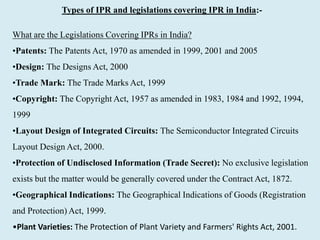 This document discusses intellectual property rights (IPR) legislation and patents in India. It provides an overview of the major IPR legislations in India covering patents, designs, trademarks, copyright, integrated circuits, trade secrets, geographical indications, and plant varieties. It also discusses requirements for patent registration, international IPR treaties and agreements India is a signatory to, types of patents, and limitations of patents. The document focuses on the Patents Act of 1970 and key aspects of the Indian patent system such as patentable and non-patentable inventions. It also distinguishes between process and product patents.