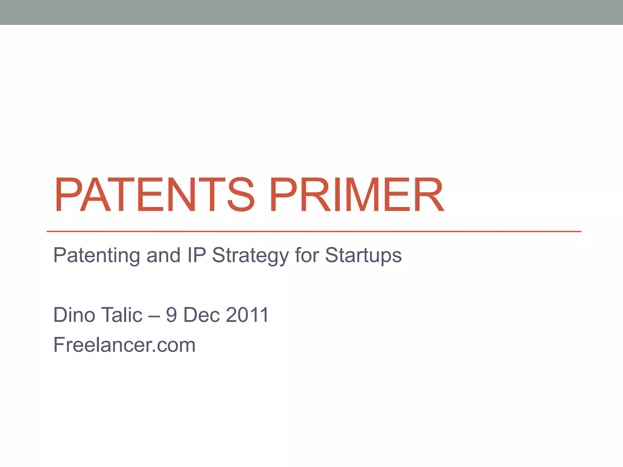 The document provides an overview of patenting and intellectual property (IP) strategy tailored for startups, highlighting various forms of IP, criteria for patentability, and the patent application lifecycle. It discusses the importance of patents in protecting competitive advantages, deterring competitors, and attracting investment, while also noting the challenges and costs involved in the process. Additionally, the document touches on controversies surrounding software patents and the differing views on their patentability in the US and EU.