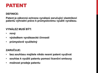 Patent je zákonnáochrana vynálezů zaručující vlastníkovi
