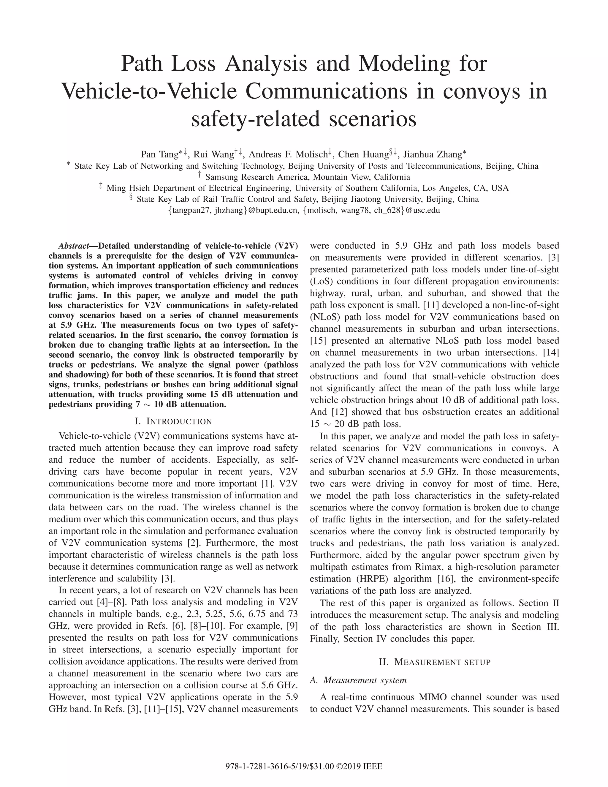 This summarizes a study that analyzed path loss for vehicle-to-vehicle communications in safety-related convoy scenarios based on channel measurements. It found that street signs, trucks, pedestrians or bushes can bring additional signal attenuation, with trucks providing around 15 dB attenuation and pedestrians providing 7-10 dB attenuation. The document described measurement setups and analyzed path loss characteristics in two types of scenarios: when the convoy formation broke up at intersections, and when the convoy link was temporarily obstructed by trucks or pedestrians.