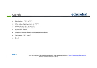This document discusses preparing for and obtaining the Project Management Professional (PMP) certification from the Project Management Institute (PMI). It provides information on PMI and the PMP credential, eligibility requirements, the application and examination process, preparation tips, and myths about the PMP exam. The document also describes Edureka's online training program for PMP certification, including live interactive classes, mock exams, course materials, and support.