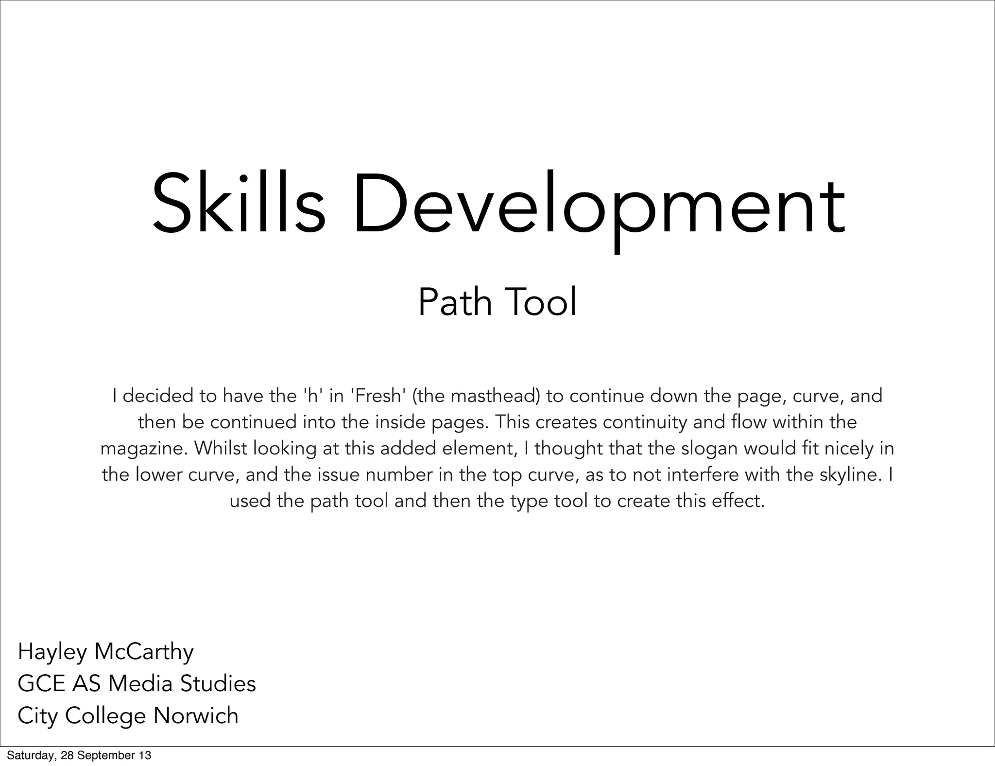 The document describes how the author used the path tool in Adobe Illustrator to create continuity between the masthead and inside pages of a magazine. Specifically, the author made the letter "h" in "Fresh" continue down the page in a curve and then back up to incorporate the issue number and slogan. First, the author drew a curved path using the pen tool while holding shift. Then, the type tool was used to add text that follows the curve of the path. This created the effect of text bending around the curve to fit within the magazine layout.