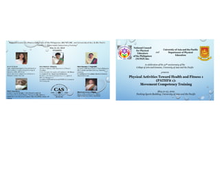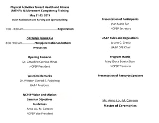 This document outlines a movement competency training program with three parts: 1) core stability and non-locomotor skills like planks, deadbugs, and bird dogs; 2) locomotor skills like crawling, jumping, running and hopping; and 3) core strength training focusing on primary movement patterns like squats, lunges, and pushups. Key points include proper form, progression from easier to more difficult variations, and applying resistance over time. The goal is to build a foundation of movement skills and core stability before integrating strength training.