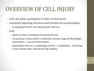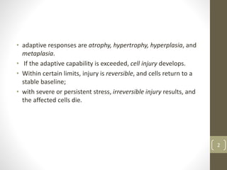 Cells are constantly adjusting to their environment and stresses to maintain homeostasis. Adaptive responses include atrophy, hypertrophy, hyperplasia and metaplasia. If stresses exceed adaptive capabilities, reversible or irreversible cell injury occurs. Causes of injury include oxygen deprivation, chemicals, infections, immune reactions, genetics, nutrition and physical agents. Injuries include ischemic, free radical and toxic injuries. Cells adapt through changes in size, number or cell type to withstand stresses or return to viability.