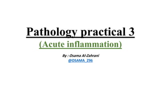 The document describes a pathology practical examining signs of acute inflammation under a microscope. The slide shows dilated blood vessels filled with red blood cells and the presence of neutrophils. The diagnosis is that these characteristics are signs of acute inflammation.