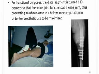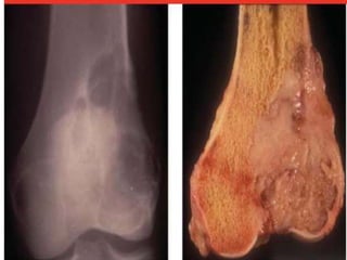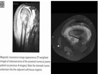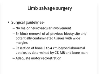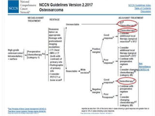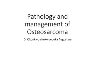 This document provides an outline and overview of osteosarcoma, including its epidemiology, pathology, clinical presentation, investigations, treatment, and prognosis. It begins with an introduction to osteosarcoma and outlines its surgical importance. Key points include that osteosarcoma most commonly affects the long bones of teenagers and young adults, neoadjuvant chemotherapy and limb salvage surgery have improved outcomes, and prognosis depends on several risk factors like tumor size and response to pre-op chemotherapy.