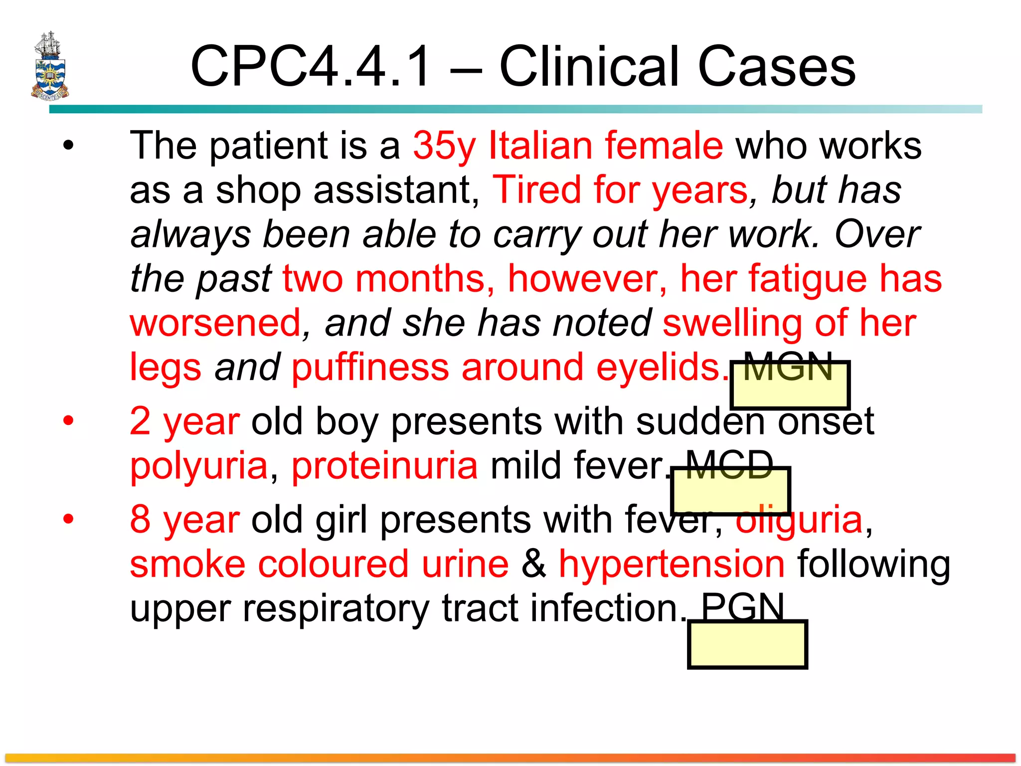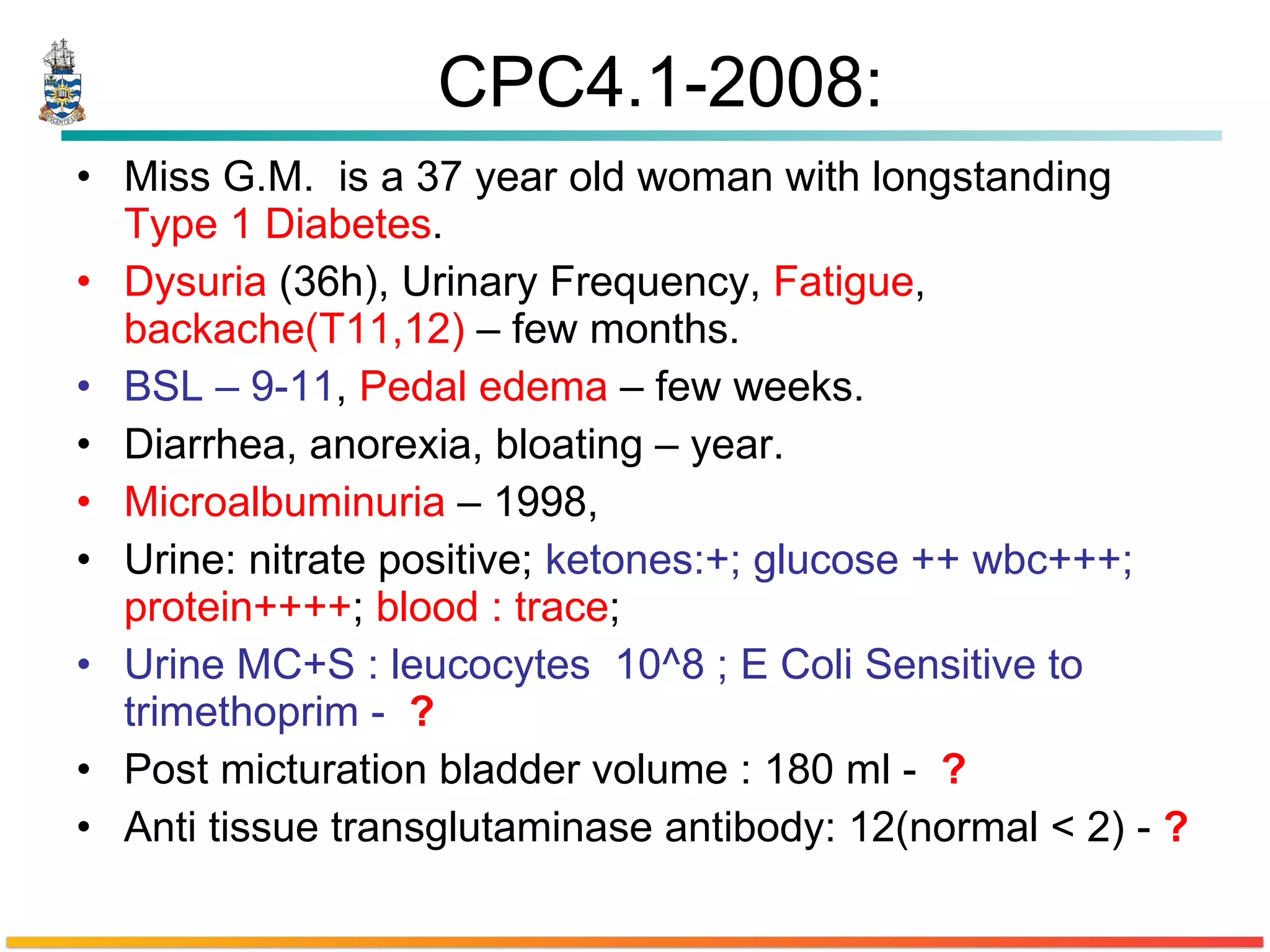 The document describes a case of a 37-year-old woman with type 1 diabetes presenting with various symptoms including dysuria, urinary frequency, fatigue, and edema. Laboratory tests showed elevated blood sugar, proteinuria, and urine positive for nitrates, ketones, glucose, protein, and red blood cells. A renal biopsy showed glomerulonephritis.