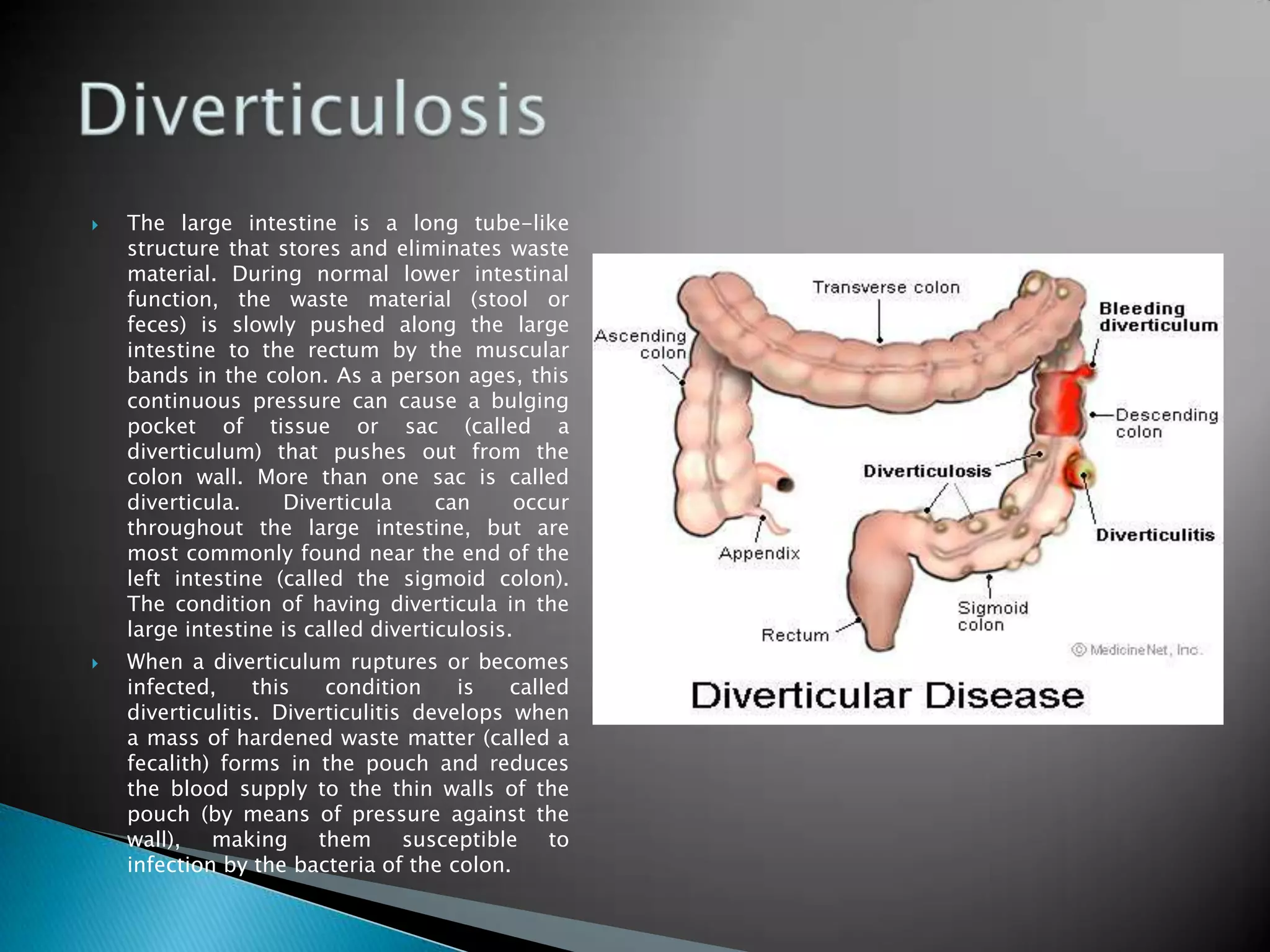 1) Diverticulosis is a condition where pouches called diverticula bulge out from weak spots in the colon wall, usually occurring where the colon joins the rectum. It becomes diverticulitis if the pouches become infected or rupture.