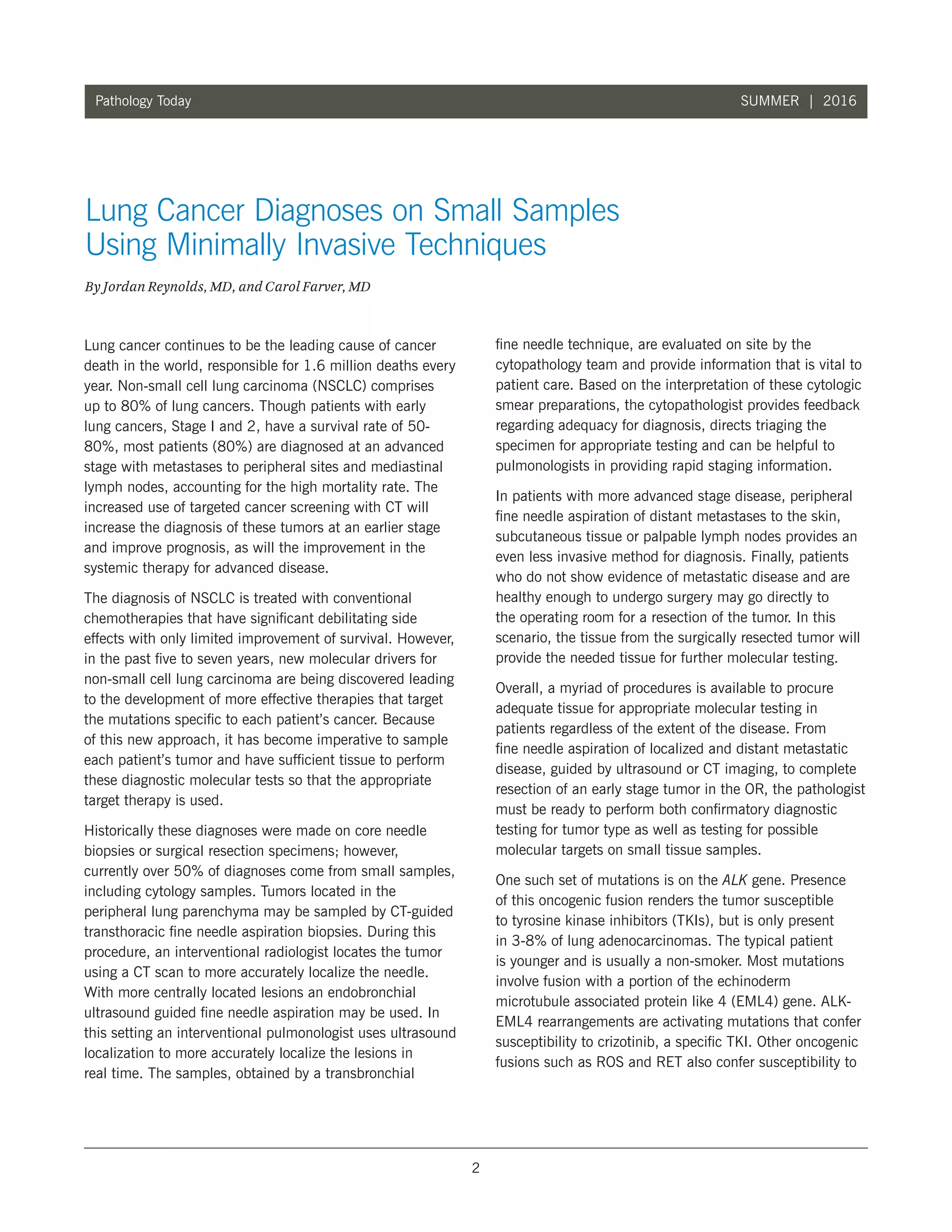 This document discusses lung cancer diagnoses made using minimally invasive techniques on small samples obtained non-surgically. It outlines various procedures like fine needle aspiration that can acquire adequate tissue for molecular testing to guide targeted therapy. Key points include: