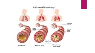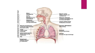 This document summarizes key aspects of the respiratory system and respiratory diseases. It begins by describing the major parts of the respiratory system - the airways, lungs, and respiratory muscles. It then details each part of the airways from nose to bronchioles. It discusses diseases like asthma and chronic obstructive pulmonary disease (COPD), outlining their causes, symptoms, classifications, pathophysiology, and treatment approaches. COPD encompasses respiratory failure, bronchitis, and emphysema.
